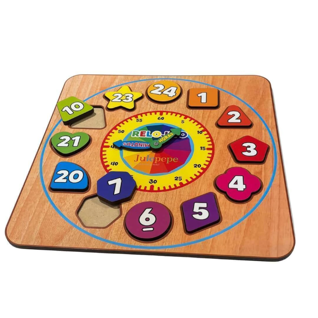 Contiene 12 piezas geométricas de diferentes formas y colores, en cada una de las caras de las figuras, de un lado hay números del 1 al 12 y del otro lado números de 13 a 24 (AM/PM), sobre un tablero de 30 x 30 cm de madera.